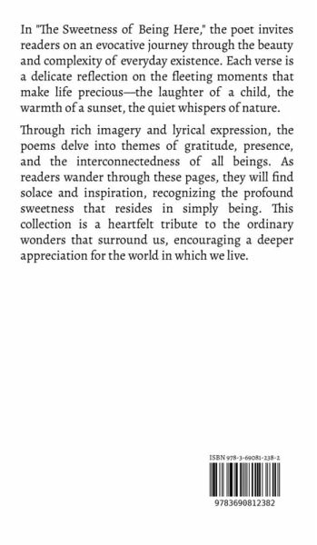 In "The Sweetness of Being Here," the poet invites readers on an evocative journey through the beauty and complexity of everyday existence. Each verse is a delicate reflection on the fleeting moments that make life precious-the laughter of a child, the warmth of a sunset, the quiet whispers of nature. Through rich imagery and lyrical expression, the poems delve into themes of gratitude, presence, and the interconnectedness of all beings. As readers wander through these pages, they will find solace and inspiration, recognizing the profound sweetness that resides in simply being. This collection is a heartfelt tribute to the ordinary wonders that surround us, encouraging a deeper appreciation for the world in which we live.