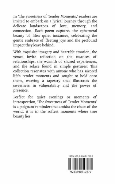 In "The Sweetness of Tender Moments," readers are invited to embark on a lyrical journey through the delicate landscapes of love, memory, and connection. Each poem captures the ephemeral beauty of life's quiet instances, celebrating the gentle embrace of fleeting joys and the profound impact they leave behind. With exquisite imagery and heartfelt emotion, the verses invite reflection on the nuances of relationships, the warmth of shared experiences, and the solace found in simple gestures. This collection resonates with anyone who has savored life's tender moments and sought to hold onto them, weaving a tapestry that illustrates the sweetness in vulnerability and the power of presence. Perfect for quiet evenings or moments of introspection, "The Sweetness of Tender Moments" is a poignant reminder that amidst the chaos of the world, it is in the softest moments where true beauty lies.