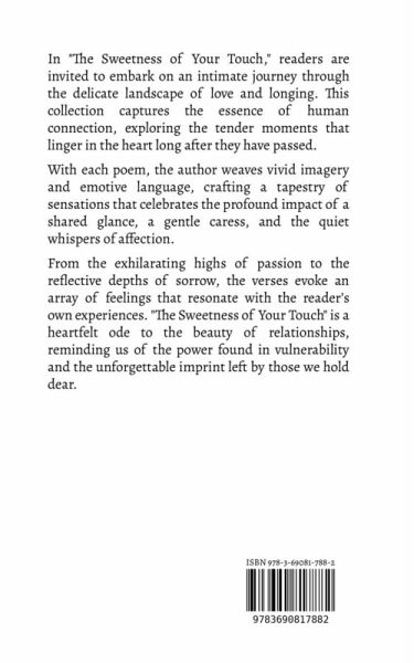 In "The Sweetness of Your Touch," readers are invited to embark on an intimate journey through the delicate landscape of love and longing. This collection captures the essence of human connection, exploring the tender moments that linger in the heart long after they have passed. With each poem, the author weaves vivid imagery and emotive language, crafting a tapestry of sensations that celebrates the profound impact of a shared glance, a gentle caress, and the quiet whispers of affection. From the exhilarating highs of passion to the reflective depths of sorrow, the verses evoke an array of feelings that resonate with the reader's own experiences. "The Sweetness of Your Touch" is a heartfelt ode to the beauty of relationships, reminding us of the power found in vulnerability and the unforgettable imprint left by those we hold dear.