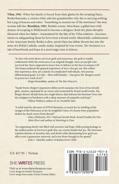 Early in The Sweetness, an inquisitive young girl asks her grandmother why she is carrying nothing but a jug of sliced lemons and water when they are forced by the Germans to evacuate their ghetto. "Something sour to remind me of the sweetness," she tells her, setting the theme for what they must remember to survive. Set during World War II, the novel is the parallel tale of two Jewish girls, cousins, living on separate continents, whose strikingly different lives ultimately converge. Brooklyn-born Mira Kane is the eighteen-year-old daughter of a well-to-do manufacturer of women's knitwear in New York. Her cousin, eight-year-old Rosha Kaninsky, is the lone survivor of a family in Vilna exterminated by the invading Nazis. But unbeknownst to her American relatives, Rosha did not perish. Desperate to save his only child during a round-up of their ghetto, her father thrusts her into the arms of a Polish Catholic candle maker, who then hides her in a root cellar¿putting her own family at risk. The headstrong and talented Mira, who dreams of escaping Brooklyn for a career as a fashion designer, finds her ambitions abruptly thwarted when, traumatized at the fate of his European relatives, her father becomes intent on safeguarding his loved ones from threats of a brutal world, and all the family must challenge his unuttered but injurious survivor guilt. Though the American Kanes endure the experience of the Jews who got out, they reveal how even in the safety of our lives, we are profoundly affected by the dire circumstances of others.