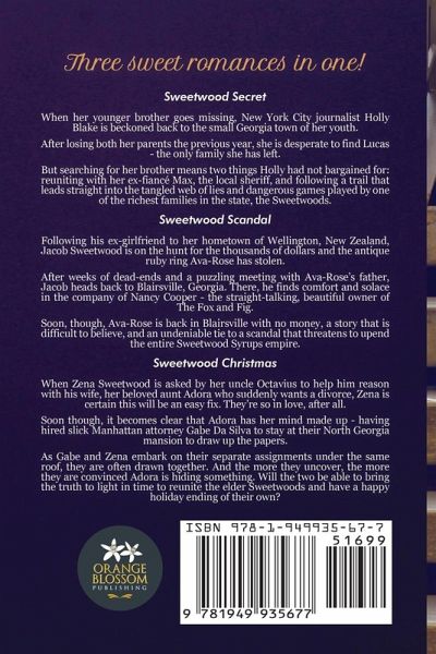 Sweetwood Secret When her younger brother goes missing, New York City journalist Holly Blake is beckoned back to the small Georgia town of her youth. After losing both her parents the previous year, she is desperate to find Lucas-the only family she has left. But searching for her brother means two things Holly had not bargained for: reuniting with her ex-fiancé Max, the local sheriff, and following a trail that leads straight into the tangled web of lies and dangerous games played by one of the richest families in the State-the Sweetwoods. Sweetwood Scandal Following his ex-girlfriend to her hometown of Wellington, New Zealand, Jacob Sweetwood is on the hunt for the thousands of dollars and the antique ruby ring Ava-Rose has stolen. After weeks of dead-ends and a puzzling meeting with Ava-Rose's father, Jacob heads back to Blairsville, Georgia. There, he finds comfort and solace in the company of Nancy Cooper-the straight-talking, beautiful owner of The Fox and Fig. Soon, though, Ava-Rose is back in Blairsville with no money, a story that is difficult to believe, and an undeniable tie to a scandal that threatens to upend the entire Sweetwood Syrups empire. Sweetwood Christmas When Zena Sweetwood is asked by her uncle Octavius to help him reason with his wife, her beloved aunt Adora who suddenly wants a divorce, Zena is certain this will be an easy fix. They're so in love, after all. Soon though, it becomes clear that Adora has her mind made up-having hired slick Manhattan attorney Gabe Da Silva to stay at their North Georgia mansion to draw up the papers. As Gabe and Zena embark on their separate assignments under the same roof, they are often drawn together. And the more they uncover, the more they are convinced Adora is hiding something. Will the two be able to bring the truth to light in time to reunite the elder Sweetwoods and have a happy holiday ending of their own?