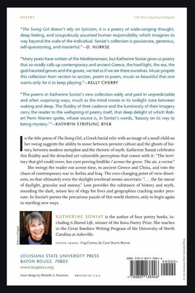 In the title poem of The Swing Girl, a Greek burial relic with an image of a small child on her swing suggests the ability to move between present culture and the ghosts of history, between modern metaphor and the rhetoric of myth. Katherine Soniat celebrates this fluidity and the detached yet vulnerable perception that comes with it: "The territory that girl could cover, her eyes peering birdlike / across the grove. The air, a vector." Soniat's new collection contemplates the present through the fragmented lens of history. She swings the reader out across time, to ancient Greece and China, and into the chaos of contemporary war in Serbia and Iraq. The ever-changing point of view disorients, so that ultimately even the daylight overhead seems uncertain: ". . . the far smear of daylight, granular and moony." Loss provides the substance of history and myth, sounding the dark, minor key of elegy for lives and geographies cracking under pressure. In Soniat's poems the precarious puzzle of this world shatters, only to begin again in startling new ways: "The story of the mountain always points somewhere / else, elusive as the tawny lion disappearing behind / the next high crag."