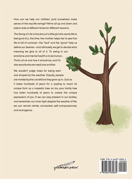 How can we help our children (and ourselves) make sense of the way life swings? We're all up and down and side to side at different times for different reasons. The Swing of Life is the story of a little girl who wants life to feel good ALL the time. Her mother helps her to see that life is full of contrast-the "bad" and the "good" help us define our desires-and ultimately, we get to decide what meaning we give to all of it. To swing in our emotions and mental health *is* to be human. That's all ok and how it should be; and it's also exactly why we need one another. Just as we wouldn't judge trees for being bent and shaped by the weather, so too, people are bent and shaped by the conditions they grow up in. If we can stay present in our bodies, and remember our inner light despite the weather of life, we can remain whole, connected, worthy, and good inside.