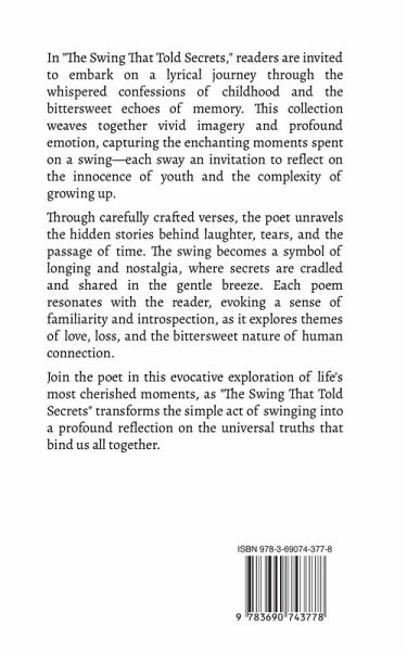 In "The Swing That Told Secrets," readers are invited to embark on a lyrical journey through the whispered confessions of childhood and the bittersweet echoes of memory. This collection weaves together vivid imagery and profound emotion, capturing the enchanting moments spent on a swing-each sway an invitation to reflect on the innocence of youth and the complexity of growing up. Through carefully crafted verses, the poet unravels the hidden stories behind laughter, tears, and the passage of time. The swing becomes a symbol of longing and nostalgia, where secrets are cradled and shared in the gentle breeze. Each poem resonates with the reader, evoking a sense of familiarity and introspection, as it explores themes of love, loss, and the bittersweet nature of human connection. Join the poet in this evocative exploration of life's most cherished moments, as "The Swing That Told Secrets" transforms the simple act of swinging into a profound reflection on the universal truths that bind us all together.