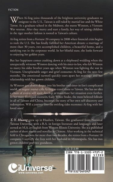When Ai-ling joins thousands of the brightest university graduates to emigrate to the U.S., Taiwan is still ruled by martial law and the White Terror. At a graduate school in the Midwest, she meets Winston, a Vietnam War veteran. After they marry and start a family, her way of raising children in the tiger mother fashion is rooted in Taiwan's culture.Ai-ling retires from a Fortune 20 company in 2008 when financial crisis begins to rock the U.S. She has finally fulfilled her American dream: a marriage of more than 30 years, two accomplished children, a beautiful home, and a satisfying run in the corporate world. In her blissful state, she looks forward to enjoying her golden years.But her happiness comes crashing down at a shipboard wedding when she unexpectedly witnesses Winston dancing with his sister-in-law, who left Winston to marry his older brother years ago when Winston was fighting the war in Vietnam. Unexplainable anger and grief consumes Ai-ling for the next few months. The emotional turmoil quickly tears apart her marriage and her relationship with her grown children. As Winston gets drawn deeper into his brother and sister-in-law's complicated world, an urgent matter calls Ai-ling to travel alone to Taiwan. She has no idea a chain of events will soon develop to exacerbate her situation even further. In her most distressed moment, Lady White Snake, the most beloved folktale in all of Taiwan and China, becomes the story of her own self-discovery and redemption. Will a journey into the swirling tides reconnect Ai-ling with her loved ones?