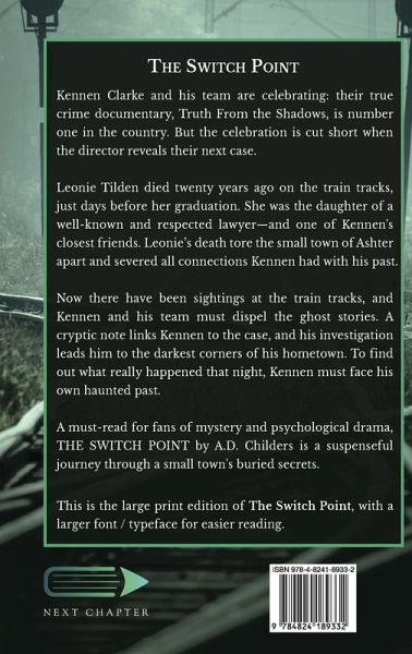 Kennen Clarke and his team are celebrating: their true crime documentary, Truth From the Shadows, is number one in the country. But the celebration is cut short when the director reveals their next case. Leonie Tilden died twenty years ago on the train tracks, just days before her graduation. She was the daughter of a well-known and respected lawyer-and one of Kennen's closest friends. Leonie's death tore the small town of Ashter apart and severed all connections Kennen had with his past. Now there have been sightings at the train tracks, and Kennen and his team must dispel the ghost stories. A cryptic note links Kennen to the case, and his investigation leads him to the darkest corners of his hometown. To find out what really happened that night, Kennen must face his own haunted past. A must-read for fans of mystery and psychological drama, THE SWITCH POINT by A.D. Childers is a suspenseful journey through a small town's buried secrets. This is the large print edition of The Switch Point, with a larger font / typeface for easier reading.