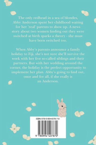The only redhead in a sea of blondes, Abby Anderson spent her childhood waiting for her 'real' parents to show up. A news story about two women finding out they were switched at birth sparks a theory - she must have been switched too. When Abby's parents announce a family holiday to Fiji, she's not sure she'll survive the week with her five so-called siblings and their partners. But with her wedding around the corner, the holiday is the perfect opportunity to implement her plan. Abby's going to find out, once and for all, if she really is an Anderson.