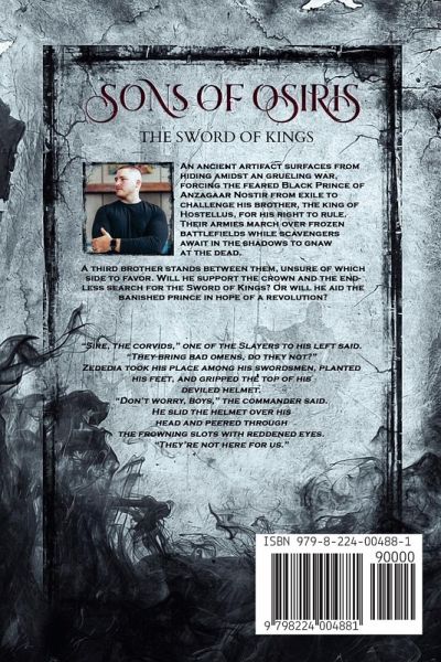 Descendants of a mighty god clash against one another for their right to rule their father's land. As an ancient artifact surfaces from hiding, two brothers send their armies over frozen battlefields to prove their dominance. Matticus, the king of Hostellus, expands his campaign for the Sword of Kings and exhausts every resource to find it. Zededia, the Black Prince, slithers from the protection of his fortress to challenge Matticus and thwart his plans at every chance he finds. A third brother stands between them, unsure of which side to favor. Prince Lucien, the youngest son of the late King Matias, struggles to find his place in the world. Both of his siblings reach to him for support, but in the end, he can only choose one side to stand on. Centuries of peace between the neighboring kingdoms rests on a razor's edge as the Sons of Osiris grow closer to reclaiming his power. War, espionage, and the heroic acts of valiant men and women fill the pages of this saga. Enter the world of Osiria and witness the supremacy of the Sons of Osiris.