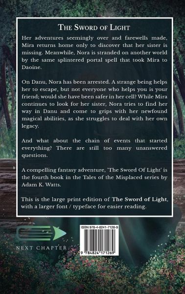 Her adventures seemingly over and farewells made, Mira returns home only to discover that her sister is missing. Meanwhile, Nora is stranded on another world by the same splintered portal spell that took Mira to Daoine. On Danu, Nora has been arrested. A strange being helps her to escape, but not everyone who helps you is your friend; would she have been safer in her cell? While Mira continues to look for her sister, Nora tries to find her way in Danu and come to grips with her newfound magical abilities, as she struggles to deal with her own legacy. And what about the chain of events that started everything? There are still too many unanswered questions. A compelling fantasy adventure, 'The Sword Of Light' is the fourth book in the Tales of the Misplaced series by Adam K. Watts. This is the large print edition of The Sword of Light, with a larger font / typeface for easier reading.