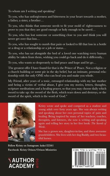 After a very painful childhood scarred from many deep wounds of alcoholism, abandonment, and abuse. As an adult, Kristy Orison became a student both in recovery and in her Christian faith. She found answers to heal and miraculously restore her estranged, toxic relationship with her mother in her mother's final days. In this raw, transparent book, Kristy shares the stages of her life: the pit, the prison, and the promise. The pit is the dysfunction into which she was born. The prison is the "people pleasing" bondage in which she lived for many years, combating piercing wounds and words. Finally, the promise is where she learned to attack her own unhealthy patterns and behaviors and be free from the lies, the snares, and the demeaning and defeating words and wounds. ¿With deeply informed compassion, Kristy shares letters, lessons, and life experiences along with inspirational thoughts and meditations for healing and forgiveness. She reveals a powerful model that she has learned to trust herself, give herself a voice, and tell her truth!
