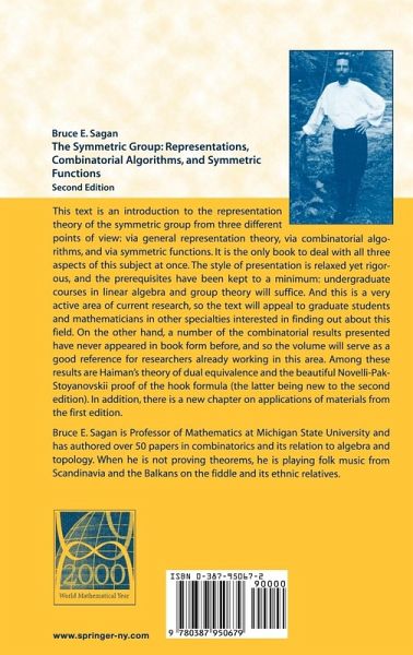 This text is an introduction to the representation theory of the symmetric group from three different points of view: via general representation theory, via combinatorial algorithms, and via symmetric functions. It is the only book to deal with all three aspects of this subject at once. The style of presentation is relaxed yet rigorous and the prerequisites have been kept to a minimum--undergraduate courses in linear algebra and group theory will suffice. And this is a very active area of current research, so the text will appeal to graduate students and mathematicians in other specialties interested in finding out about this field. On the other hand, a number of the combinatorial results presented have never appeared in book form before and so the volume will serve as a good reference for teachers already working in this area. Among these results are Haiman's theory of dual equivalence and the beautiful Novelli-Pak-Stoyanovskii proof of the hook formula (the latter being new to the second edition). In addition, there is a new chapter on applications of materials from the first edition. Bruce Sagan is Professor of Mathematics at Michigan State University and has authored over 50 papers in combinatorics and its relation to algebra and topology. When he is not proving theorems, he is playing folk music from Scandinavian and the Balkans on the fiddle and its ethnic relatives.