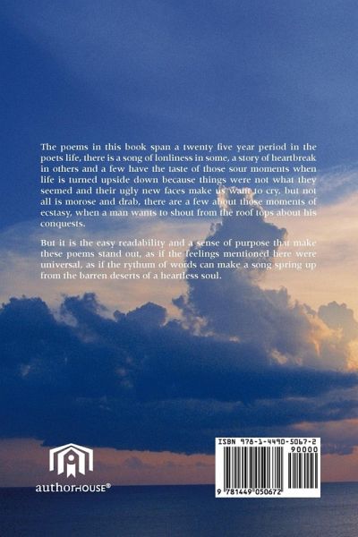 The poems in this book span a twenty five year period in the poets life, there is a song of lonliness in some , a story of heartbreak in others and a few have the taste of those sour moments when life is turned upside down because things were not what they seemed and their ugly new faces make us want to cry, but not all is morose and drab, there are a few about those moments of ecstasy, when a man wants to shout from the roof tops about his conquests. But it is the easy readability and a sense of purpose that make these poems stand out , as if the feelings mentioned here were universal , as if the rythum of words can make a song spring up from the barren deserts of a heartless soul.