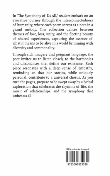 In "The Symphony of Us All," readers embark on an evocative journey through the interconnectedness of humanity, where each poem serves as a note in a grand melody. This collection dances between themes of love, loss, unity, and the fleeting beauty of shared experiences, capturing the essence of what it means to be alive in a world brimming with diversity and commonality. Through rich imagery and poignant language, the poet invites us to listen closely to the harmonies and dissonances that define our existence. Each piece resonates with a deep sense of empathy, reminding us that our stories, while uniquely personal, contribute to a universal chorus. As you turn the pages, prepare to be swept away by a lyrical exploration that celebrates the rhythms of life, the music of relationships, and the symphony that unites us all.