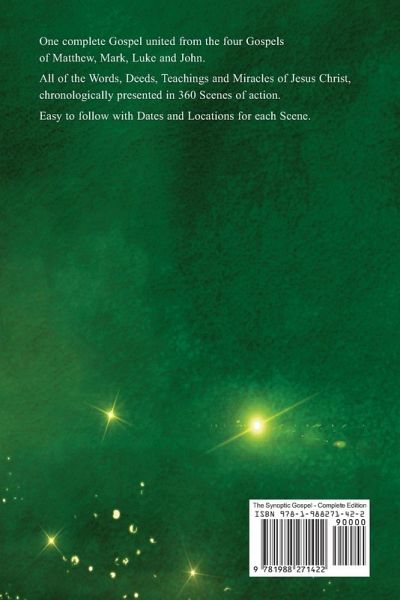 The Four Gospels United as One - See every Gospel Word and Deed of Jesus Christ in Order. This advanced Four Gospel Harmony and word-for-word Merger presents all of the events from the full Gospel Life of Jesus Christ in chronological order. Synoptic (syn + optic) means "seeing together" or "seeing as one", and the text of this book is reprinted from the unified fifth column of the Four Gospel Harmony and word-for-word Merger, "FIVE COLUMN: The Synoptic Gospel", which chronologically aligns all of the sets of parallel verses from the four Gospel accounts according to sixteen-step Harmonization and Merging process. With the overlap and duplication between the parallel sections of verses harmonized on a true word-for-word basis, the resulting clear and easy-to-read unified text is almost 22% shorter to read, compared to reading the four individual Gospel accounts back-to-back. Dates and locations, along with nine maps of Israel and of Jerusalem, show when and where each event happened, so that you can follow all of the action as Jesus travelled during the years of His public ministry. Understanding the meaning and message of the Gospel story is further enhanced with 350+ references to the Old Testament Scriptures, along with the historical people and places that are mentioned. The Synoptic Gospel story divided into ten Chapters, with 360 Scenes of action, so that you can read, study and meditate on one Scene a day, to know the full Gospel story of the Life and message of Jesus Christ in a year! This Complete Edition includes these features: 1. The entire unified Gospel story presented in chronological order 2. Date and Location of each Scene 3. 350+ references to the Old Testament Scriptures, historical figures and places 4. Nine Chapter Maps of Israel and of Jerusalem 5. Full set of Notes 6. An Overview of The Four Gospels, including the Four Gospels Comparison Chart 7. Seven Articles about the creation and compilation of the Four Gospel Harmony and word-for-word Merger, "FIVE COLUMN: The Synoptic Gospel" 8. The Gospel Verse Cross-Reference Appendix - shows if any verse from the Four Gospels is part of a parallel set, and where that verse is located