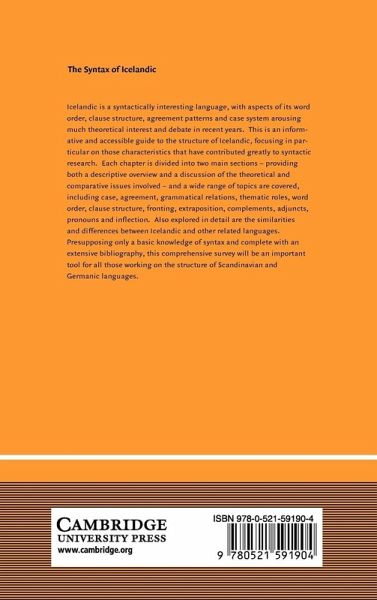 Icelandic is a syntactically interesting language, with aspects of its word order, clause structure, agreement patterns and case system arousing much theoretical interest and debate in recent years. This is an informative and accessible guide to the structure of Icelandic, focusing in particular on those characteristics that have contributed greatly to syntactic research. Each chapter is divided into two main sections - providing both a descriptive overview and a discussion of the theoretical and comparative issues involved - and a wide range of topics are covered, including case, agreement, grammatical relations, thematic roles, word order, clause structure, fronting, extraposition, complement, adjuncts, pronouns, and inflection. Also explored in detail are the similarities and differences between Icelandic and other related languages. Presupposing only a basic knowledge of syntax and complete with an extensive bibliography, this comprehensive survey will be an important tool for all those working on the structure of Scandinavian and Germanic languages.
