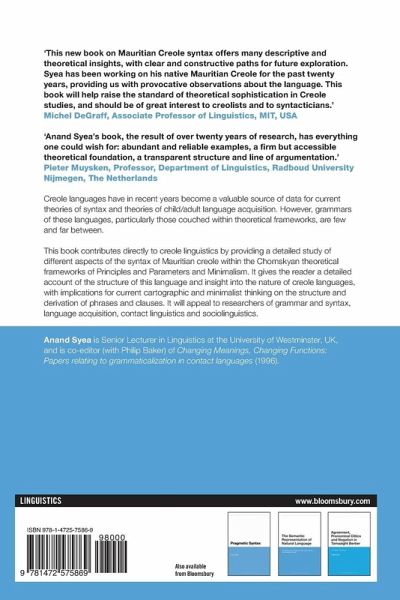 Creole languages have in recent years become a valuable source of data for current theories of syntax and theories of child/adult language acquisition. However, grammars of these languages, particularly those couched within theoretical frameworks of one kind of another, are few and far between. This book contributes directly to creole linguistics by providing a detailed study of different aspects of the syntax of Mauritian creole within the theoretical framework of Principles and Parameters (Chomsky, 1981) and Minimalism (1995). It gives the reader a detailed account of the structure of this language and insight into the nature of creole languages, with implications for current cartographic and minimalist thinking on the structure and derivation of phrases and clauses. It will appeal to researchers of grammar and syntax, language acquisition, contact linguistics and sociolinguistics.