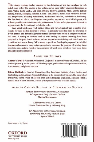 This volume contains twelve chapters on the derivation of and the correlates to verb initial word order. The studies in this volume cover such widely divergent languages as Irish, Welsh, Scots Gaelic, Old Irish, Biblical Hebrew, Jakaltek, Mam, Lummi (Straits Salish), Niuean, Malagasy, Palauan, K'echi', and Zapotec, from a wide variety of theoretical perspectives, including Minimalism, information structure, and sentence processing. The first book to take a cross-linguistic comparative approach to verb initial syntax, this volume provides new data to some old problems and debates and explores some innovative approaches to the derivation of verb initial order.