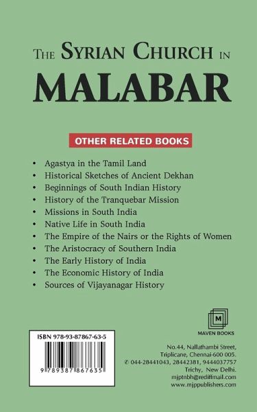 The Syrian Church in Malabar is an institution which, on account of its antiquity, its wonderful preservation of the Syriac Scriptures and Liturgy, and the persecution its bishops suffered under the Portuguese, has, at all times, attracted the interest of the historian, roused the curiosity of the traveller, and elicited the wonder and admiration of the antiquarian. Contents: Introduction, Chapter 1 - St. Thomas the Apostle of India, Chapter 2 - The Early Eastern Church, Chapter 3 - The India Church from 498 A.D. - 1599 A.D. , Chapter 4 - The Synod of Diamper 1599 A.D.
