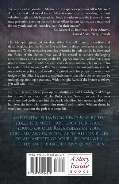 Humble upbringings did not deter Allen Maxwell from an incredible and dynamic global journey in the Navy and later in the private sector as a defense contractor. While navigating complex dynamics in both worlds, he developed the Rules of the System that would be critical to survive challenging circumstances such as serving in the Philippines amid political unrest, a near death collision on the USS Kinkaid, and a devious internal plan to usurp his leadership in Guantanamo Bay. As a businessman, he lost millions, saw the underbelly of politics, and steadfastly gained back his prosperity with a new insight on his allies. He came to resolutely know that while the system can be unforgiving, nothing is personal. With the right Rules of the System to follow, you will win. For the first time, Allen opens up his valuable vault of knowledge and brings his extraordinary story, and the Rules of the System, to you. He gives testimony and credit to not just the people who lifted him up and guided him, but even the folks who caused him turmoil and trouble. Without them, he would not have seen the path to a better life. The System is Unforgiving: Play by the Rules is a must-have book for those young or old. Regardless of your circumstances, if you apply Allen's rules to all aspects of your life, you will succeed in the face of any opposition.