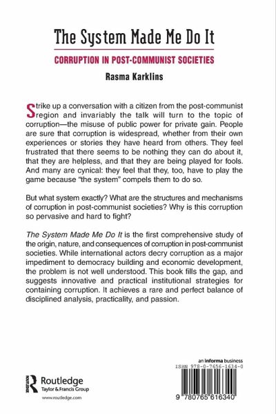 Strike up a conversation with a citizen from the post-communist region and invariably the talk will turn to the topic of corruption - the misuse of public power for private gain. People are sure that corruption is widespread, whether from their own experiences or stories they have heard from others. They feel frustrated that there seems to be nothing they can do about it, that they are helpless, and that they are being played for fools. And many are cynical: they feel that they, too, have to play the game because "the system" compels them to do so. But what system exactly? What are the structures and mechanisms of corruption in post-communist societies? "The System Made Me Do It" is the first comprehensive study of the origin, nature, and consequences of corruption in post-communist societies. While international actors decry corruption as a major impediment to democracy building and economic development, the problem is not well understood. This book fills that gap, and suggests innovative and practical institutional strategies for containing corruption. It achieves a rare and perfect balance of disciplined analysis, practicality, and passion.