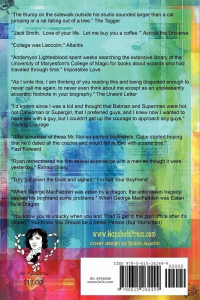 The Tagger by Ginger Mayerson; Across the Universe, by Laura Dearlove; Atlantis by Kitty Johnson; Impossible Love by Kathryn L. Ramage; The Unsent Letter by Chad Denton; Finding Courage by Gail Marlowe; Fast Forward by Logan; Extraordinary by Emily-Jane MacKenzie; I'm Not Your Boyfriend by Lene Taylor; When George MacFadden was Eaten by a Dragon by Colleen Wylie; You Know You Should be a Better Person (But You're Not) by Karmen Ghia; Mick and Mark by Molly Kiely. More information, especially on covers, at the WapshottPress.com