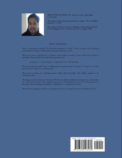 This is a poetrybook entitled, The Taj Mahal: Quatrains 1 to 80". This is a long ode to the Taj Mahal. This is a third edition. The poetrybook is divided into 4 chapters. Each chapter has 5 sonts. Each sont has 4 quatrains. The total number of quatrains is 80 quatrains since: 4 chapters x 5 sonts/chapter x 4 quatrains/sont = 80 quatrains. What is a "sont"? The poet invents the word "sont" to differentiate his poems from a "sonnet". The poet defines "sont" as a "16 line poem". A "sonnet" is a 14 line poem. The long poem was first written between September-October 2002 in Milpitas (California). The long poem is now published via lulu.com on November 11, 2016, Friday as a first edition. The third edition is released on January 3, 2017. The original long poem is 100 quatrains but I cut off the 100 quatrains to 80 quatrains for this book. The remaining 20 quatrains is transferred to a sequel. The author plans to release a second poetrybook or a sequel about the Taj Mahal by 2017.