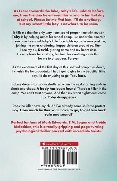As I race towards the lake, Toby's life unfolds before me, from the day he entered this world to his first day at school. Please let me find him. I'll do anything. But my sweet little boy is nowhere to be seen. It kills me that the only way I can spend proper time with my son Toby is by helping out at his school camp. I sit under the emerald green pine trees and Toby's little face lights up as he runs past me, joining the other chattering, happy children around us. Then I see my ex, David, glaring at me and my heart sinks. He may have full custody, but he'd love nothing more than for me to disappear. Forever. As the excitement of the first day at this isolated camp dies down, I cherish the long goodnight hug I get to give to my beautiful little boy. I'd do anything to get Toby back. But my dreams for us are shattered when the next morning ends in shock and chaos. A body has been found. There's a killer in the camp. We can't trust anyone. And then my worst nightmares come true: Toby disappears. Does the killer have my child? I've already come so far to protect Toby. How much further will I have to go, to get him back safe and sound? Perfect for fans of Mark Edwards, T.M. Logan and Freida McFadden, this is a totally gripping and page-turning psychological thriller packed with incredible twists.