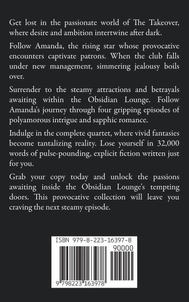 Get lost in the passionate world of The Takeover, where desire and ambition intertwine after dark. Follow Amanda, the rising star whose provocative encounters captivate patrons. When the club falls under new management, simmering jealousy boils over. Surrender to the steamy attractions and betrayals awaiting within the Obsidian Lounge. Follow Amanda's journey through four gripping episodes of polyamorous intrigue and sapphic romance. Indulge in the complete quartet, where vivid fantasies become tantalizing reality. Lose yourself in 32,000 words of pulse-pounding, explicit fiction written just for you. Grab your copy today and unlock the passions awaiting inside the Obsidian Lounge's tempting doors. This provocative collection will leave you craving the next steamy episode.