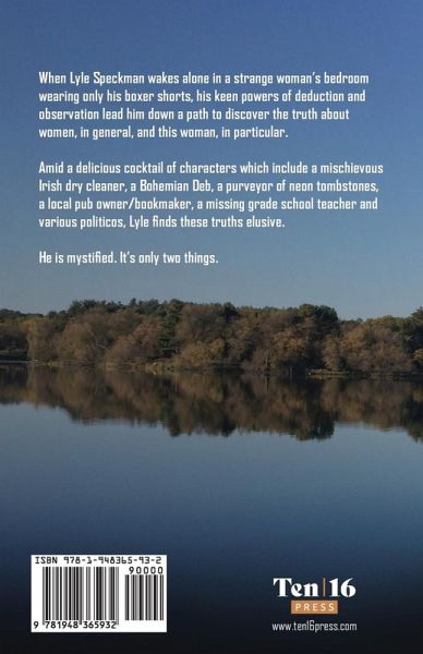 When Lyle Speckman wakes alone in a strange woman's bedroom wearing only his boxer shorts, his keen powers of deduction and observation lead him down a path to discover the truth about women, in general, and this woman, in particular. Amid a delicious cocktail of characters which include a mischievous Irish dry cleaner, a Bohemian Deb, a purveyor of neon tombstones, a local pub owner/bookmaker, a missing grade school teacher and various politicos, Lyle finds these truths elusive. He is mystified. It's only two things.