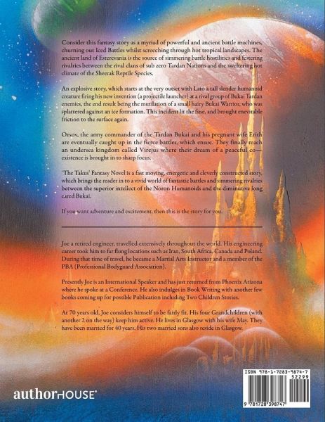 Consider this fantasy story as a myriad of powerful and ancient battle machines, churning out Iced Battles whilst screeching through hot tropical landscapes. The ancient land of Esterevania is the source of simmering battle hostilities and festering rivalries between the rival clans of sub zero Tardan Nations and the sweltering hot climate of the Sheerak Reptile Species. An explosive story, which starts at the very outset with Lato a tall slender humanoid creature firing his new invention (a projectile launcher) at a rival group of Bukai Tardan enemies, the end result being the mutilation of a small hairy Bukai Warrior, who was splattered against an ice formation. This incident lit the fuse, and brought enevitable friction to the surface again. Orsov, the army commander of the Tardan Bukai and his pregnant wife Erith are eventually caught up in the fierce battles, which ensue. They finally reach an undersea kingdom called Virejus where their dream of a peaceful co-existence is brought in to sharp focus. 'The Takus' Fantasy Novel is a fast moving, energetic and cleverly constructed story, which brings the reader in to a vivid world of fantastic battles and simmering rivalries between the superior intellect of the Noron Humanoids and the diminutive long eared Bukai. If you want adventure and excitement, then this is the story for you.