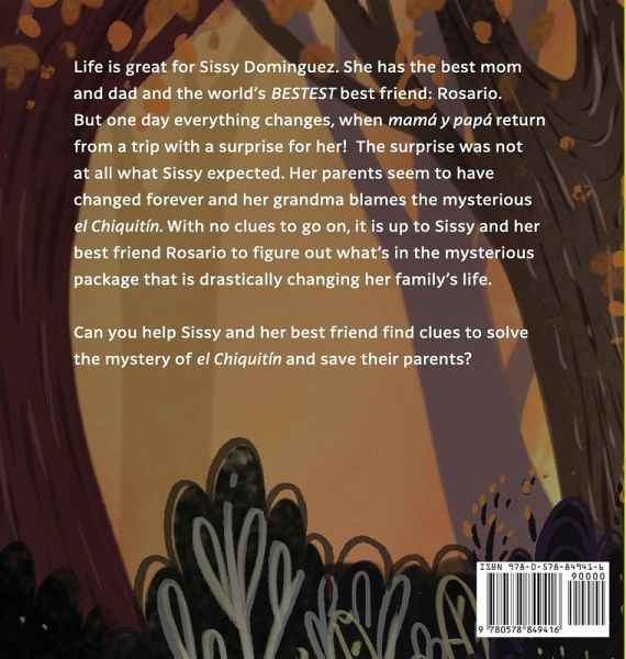 Life is great for Sissy Dominguez. She has the best mom and dad and the world's BESTEST best friend: Rosario. But one day everything changes, when mamá y papá return from a trip with a surprise for her! The surprise was not at all what Sissy expected. Her parents seem to have changed forever and her grandma blames the mysterious el Chiquitín. With no clues to go on, it is up to Sissy and her best friend Rosario to figure out what's in the mysterious package that is drastically changing her family's life. Can you help Sissy and her best friend find clues to solve the mystery of el Chiquitín and save their parents?