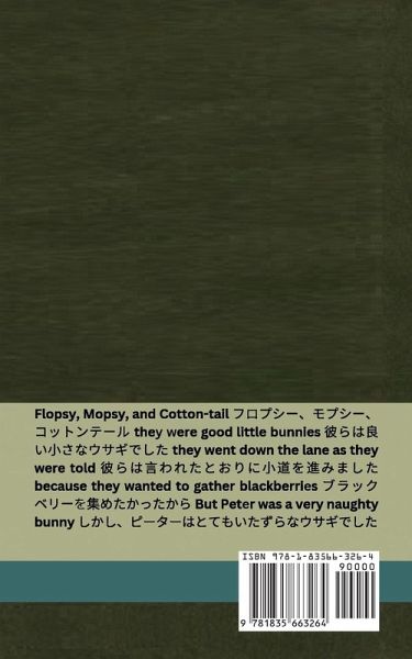 Flopsy, Mopsy, and Cotton-tail Flopsy, Mopsy e rabo de algodão they were good little bunnies eles eram bons coelhinhos they went down the lane as they were told eles desceram a pista como lhes foi dito because they wanted to gather blackberries porque queriam apanhar amoras But Peter was a very naughty bunny Mas Pedro era um coelhinho muito and he ran straight to Mr. McGregor's garden e correu direto para o jardim do Sr. McGregor and he squeezed under the gate! e ele apertou debaixo do portão! First he ate some lettuces Primeiro comeu umas alfaces then he ate some French beans depois comeu um pouco de feijão francês and then he ate some radishes e depois comeu uns rabanetes