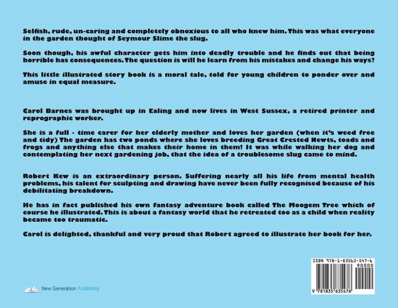 Selfish, rude, un-caring and completely obnoxious to all who knew him. This was what everyone in the garden thought of Seymour Slime the slug. Soon though, his awful character gets him into deadly trouble and he finds out that being horrible has consequences. The question is will he learn from his mistakes and change his ways? This little illustrated story book is a moral tale, told for young children to ponder over and amuse in equal measure. Carol Barnes was brought up in Ealing and now lives in West Sussex, a retired printer and reprographic worker. She is a full - time carer for her elderly mother and loves her garden (when it's weed free and tidy) The garden has two ponds where she loves breeding Great Crested Newts, toads and frogs and anything else that makes their home in them! It was while walking her dog and contemplating her next gardening job, that the idea of a troublesome slug came to mind. Robert Kew is an extraordinary person. Suffering nearly all his life from mental health problems, his talent for sculpting and drawing have never been fully recognised because of his debilitating breakdown. He has in fact published his own fantasy adventure book called The Moogem Tree which of course he illustrated. This is about a fantasy world that he retreated too as a child when reality became too traumatic. Carol is delighted, thankful and very proud that Robert agreed to illustrate her book for her.