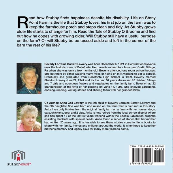 Read how Stubby finds happiness despite his disability. Life on Stony Point Farm is the life that Stubby loves, his first job on the farm was to keep the farmhouse porch and steps clean and tidy. As Stubby grows older life starts to change for him. Read the Tale of Stubby Q Broome and find out how he copes with growing older. Will Stubby still have a useful purpose on the farm? Or will Stubby be be tossed aside and left in the corner of the barn the rest of his life?