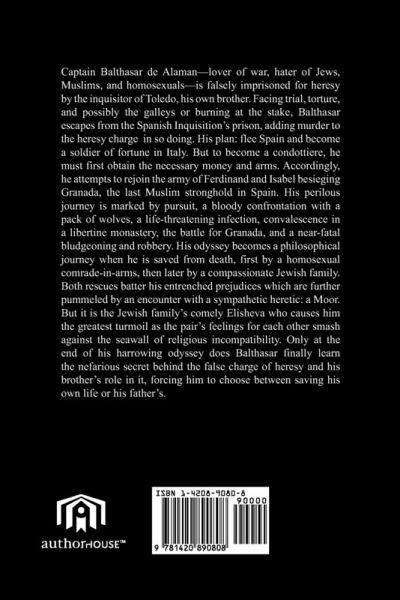 Captain Balthasar de Alaman--lover of war, hater of Jews, Muslims, and homosexuals--is falsely imprisoned for heresy by the inquisitor of Toledo, his own brother. Facing trial, torture, and possibly the galleys or burning at the stake, Balthasar escapes from the Spanish Inquisition's prison, adding murder to the heresy charge in so doing. His plan: flee Spain and become a soldier of fortune in Italy. But to become a condottiere, he must first obtain the necessary money and arms. Accordingly, he attempts to rejoin the army of Ferdinand and Isabel besieging Granada, the last Muslim stronghold in Spain. His perilous journey is marked by pursuit, a bloody confrontation with a pack of wolves, a life-threatening infection, convalescence in a libertine monastery, the battle for Granada, and a near-fatal bludgeoning and robbery. His odyssey becomes a philosophical journey when he is saved from death, first by a homosexual comrade-in-arms, then later by a compassionate Jewish family. Both rescues batter his entrenched prejudices which are further pummeled by an encounter with a sympathetic heretic: a Moor. But it is the Jewish family's comely Elisheva who causes him the greatest turmoil as the pair's feelings for each other smash against the seawall of religious incompatibility. Only at the end of his harrowing odyssey does Balthasar finally learn the nefarious secret behind the false charge of heresy and his brother's role in it, forcing him to choose between saving his own life or his father's.