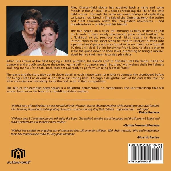 Riley Chester-field Mouse has acquired both a name and some friends in this 2nd book of a series chronicling the life of the little field mouse. Through the same easy-read poetry and captivating caricatures exhibited in The Tale of the Christmas Hero, the author and artist comically relate the imaginative adventures -- and misadventures -- of Riley and his friends. The tale begins on a crisp, fall morning as Riley hastens to join his friends in their newly-discovered game called football. In a flashback to the previous week, Riley recalls his disastrous introduction to the sport when he tried to interject himself into a people-boys' game and was found to be no match for a football 10 times his size! But his inventive friend, Gus, hatched a plan to scale the game down to their level, promising to bring a mouse-sized ball to their next Saturday play date. When Gus arrives at the field lugging a HUGE pumpkin, his friends scoff in disbelief until he climbs inside the pumpkin and proudly produces the perfect game ball -- a pumpkin seed! So, then, "with walnut shells for helmets and long toenails for cleats, both teams stood ready to perform amazing football feats!!" The game and the story play out in clever detail as each mouse team scrambles to conquer the scoreboard before the hungry little Gus devours all the delicious-tasting balls! Through a delightful twist at the end of the tale, the little mice discover friendship to be the real victor in their competition. The Tale of the Pumpkin Seed Squad is a delightful commentary on competition and sportsmanship that will surely charm even the least of its budding-athlete readers.