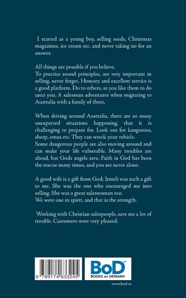 A salesmans adventures when migrating to Australia with a family of three. There are so many unexpected situations happening, that it is difficult to prepare for. Many troubles are ahead, but Gods angels saves many times. Starting a business is always a challenge. Distributing giftware around Australia, gets us to know Australia very well, by coming back to the same location several times every year. You can read about tourist attractions in several places in this book.I started as a young boy, selling seeds, papers,icecream etc. Never take no for an answer. All thingsare possible, if you believe. Good principles are veryimportant in selling, never forget. Honesty and goodservice is a good plattform. Do to others, as you likethem to do unto you. A salesmans adventures whenmigrating to Australia with a family of three. Whendriving around Australia, there are so manyunexpected situations happening, that it is difficultto prepare for. Look out for kangaroos, sheep, emu'setc. They can wreck your vehicle. Some dangerouspeople are also moving around, and can make yourlife dangerous. Many troubles are ahead, but Godsangels saves. Faith in God has been the rescue manytimes, you are never alone. A good wife is a gift fromGod, Irmeli was such a gift to me. She was the onewho encouraged me into selling. She was a greatsaleswoman too. We were one in spirit, and that isstrength. Working with christian salesmen, saved mea lot of trouble. Customers were very pleased.Ps. 37:19 Many are the afflictions of the righteous but the Lord delivereth him out of them all!Ps. 37:39 But the salvation of the righteous is of the Lord, He is their strength in the time of trouble.