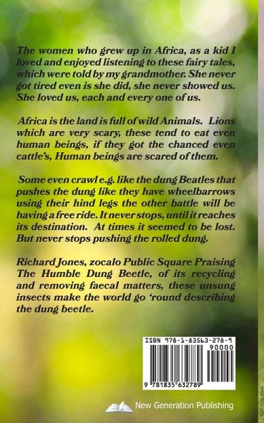 The women who grew up in Africa, as a kid I loved and enjoyed listening to these fairy tales, which were told by my grandmother. She never got tired even is she did, she never showed us. She loved us, each and every one of us. Africa is the land is full of wild Animals. Lions which are very scary, these tend to eat even human beings, if they got the chanced even cattle's, Human beings are scared of them. Some even crawl e.g. like the dung Beatles that pushes the dung like they have wheelbarrows using their hind legs the other battle will be having a free ride. It never stops, until it reaches its destination. At times it seemed to be lost. But never stops pushing the rolled dung. Richard Jones, zocalo Public Square Praising The Humble Dung Beetle, of its recycling and removing faecal matters, these unsung insects make the world go 'round describing the dung beetle.