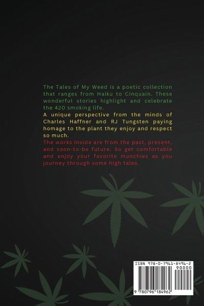 The Tales of My Weed is a poetic collection that ranges from Haiku to Cinquain. These wonderful stories highlight and celebrate the 420 smoking life. A unique perspective from the minds of Charles Haffner and RJ Tungsten paying homage to the plant they enjoy and respect so much. The works inside are from the past, present, and soon-to-be future. So get comfortable and enjoy your favorite munchies as you journey through some high tales.