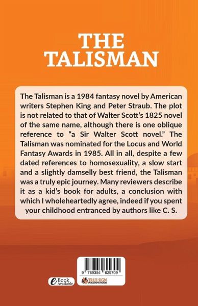 The Talisman is a 1984 fantasy novel by American writers Stephen King and Peter Straub. The plot is not related to that of Walter Scott's 1825 novel of the same name, although there is one oblique reference to "a Sir Walter Scott novel." The Talisman was nominated for the Locus and World Fantasy Awards in 1985. All in all, despite a few dated references to homosexuality, a slow start and a slightly damselly best friend, the Talisman was a truly epic journey. Many reviewers describe it as a kid's book for adults, a conclusion with which I wholeheartedly agree, indeed if you spent your childhood entranced by authors like C. S.…mehr