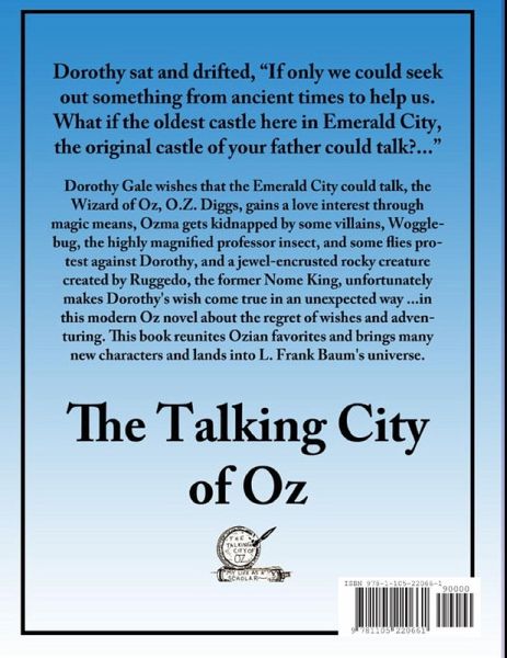 Dorothy Gale wishes that the Emerald City could talk, the Wizard of Oz, O.Z. Diggs, gains a love interest through magic means, Ozma gets kidnapped by some villains, Wogglebug, the highly magnified professor insect, and some flies protest against Dorothy, and a jewel-encrusted rocky creature created by Ruggedo, the former Nome King, unfortunately makes Dorothy's wish come true in an unexpected way ...in this modern Oz novel about the regret of wishes and adventuring. This book reunites Ozian favorites and brings many new characters and lands into L. Frank Baum's universe.