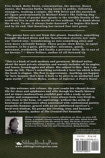 Fire Island, Bette Davis, reincarnation, the movies, Henry James, the Russian baths, being lonely in public, following strangers, washing a corpse, the FDR Drive and the racetrack all figure predominantly in Michael Klein's The Talking Day - a talking book of poems that speak to the terrible beauty of the world we live in and the world we live without. "I'm dumb about the world. To me, it always looks haunted" is the first line of the first poem in this book and by the end, that haunting has turned fear into grace.