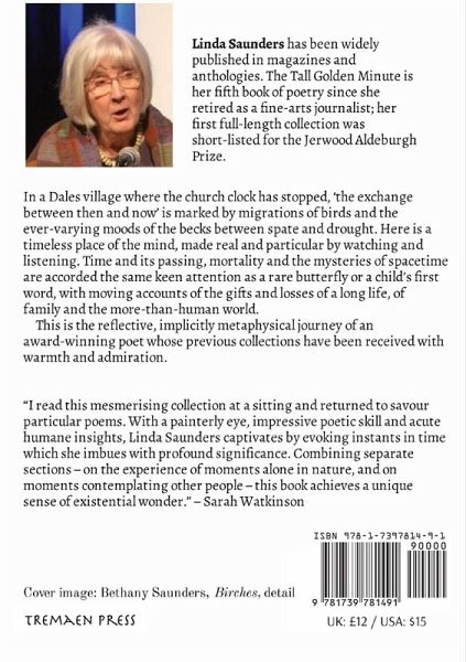 A mesmeric new collection from Linda Saunders whose previous books have been warmly praised: '...beautifully achieved, evocative and tender with such a strong feel for the brilliance of each minute inside passing time.' - Helen Dunmore 'Saunders shows the world cherished by our watchfulness, life lived in rapt attention.' - Carrie Etter For our souls' health, we need to go on gazing, stopped in our tracks and sorrows, to mark the arrivals of birds that cross the world above our news and wars, our migrations of loss. Long-haul passerines with their songs of summer. The swifts twenty-four/seven on the wing. In her latest collection of poems, Linda Saunders draws the reader into a world of quiet intensity, exploring the wildlife, countryside and community of a much loved and long explored corner of the north of England so that we feel we are intimate with it, our consciousness expanded and refreshed by it. In a Dales village where the church clock has stopped, 'the exchange of then and now' is marked by migrations of birds and the ever-varying moods of the becks between spate and drought. Here is a timeless place of the mind, made real and particular by watching and listening. Thus grounded, the poems venture into speculative territory: ...Who'd swear anyway that time exists, but only the exchange of then and now between noon and midnight, this late sun throwing shadows of trees not yet in leaf across the field, so that celandines purse their stars in the shivering grass, though the clock face catches brilliance still above the rising tide of dusk. The poems broaden out from the 'tall golden minute', now to the mysteries of time and space as illuminated by modern physics, now to a feeling of existential wonder, and above all to the human world of relationships with strangers, friends and family, profound experiences of love and grief, closeness and distance. In a second section the collection explores a slightly more urban world, but, tuned in by the first section to harmony with the natural world, we find no shortage of wonders here, along with the larger cast of human residents and visitors encountered by chance or design. A third section looks back to childhood, celebrates and mourns parents, rejoices in grownup sons and grandchildren, and shares the grief of untimely bereavement. Time and mortality are accorded the same keen attention as a rare butterfly or a child's first word, with moving accounts of the gifts and losses of a long life. This collection runs the gamut of human emotions, and does so in the context of the affirmation and celebration of life implicit in the intensity of focus and the precision and beauty of lyrical language that are this poet's hallmarks. This is the reflective, implicitly metaphysical journey of an award-winning poet whose previous collections have been received with warmth and admiration. 2,881 characters