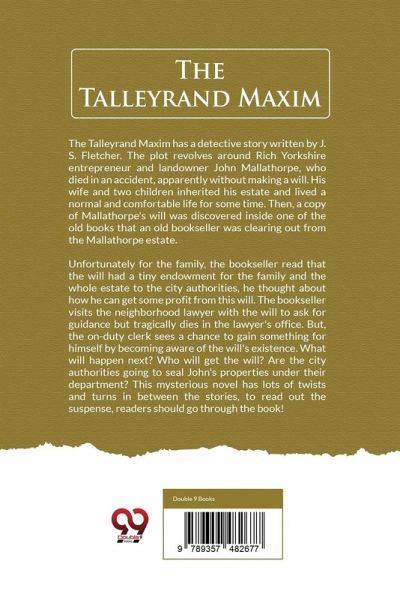 The Talleyrand Maxim has a detective story written by J. S. Fletcher. The plot revolves around Rich Yorkshire entrepreneur and landowner John Mallathorpe, who died in an accident, apparently without making a will. His wife and two children inherited his estate and lived a normal and comfortable life for some time. Then, a copy of Mallathorpe's will was discovered inside one of the old books that an old bookseller was clearing out from the Mallathorpe estate. Unfortunately for the family, the bookseller read that the will had a tiny endowment for the family and the whole estate to the city…mehr