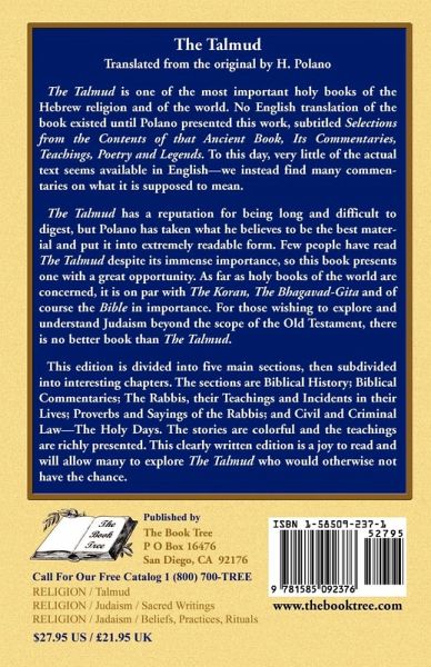 The Talmud is one of the most important holy books of the Hebrew religion and of the world. No English translation of the book existed until the author presented this work. To this day, very little of the actual text seems available in English -- although we find many interpretive commentaries on what it is supposed to mean. The Talmud has a reputation for being long and difficult to digest, but Polano has taken what he believes to be the best material and put it into extremely readable form. As far as holy books of the world are concerned, it is on par with The Koran, The Bhagavad-Gita and, of course, The Bible, in importance. This clearly written edition will allow many to experience The Talmud who may have otherwise not had the chance.