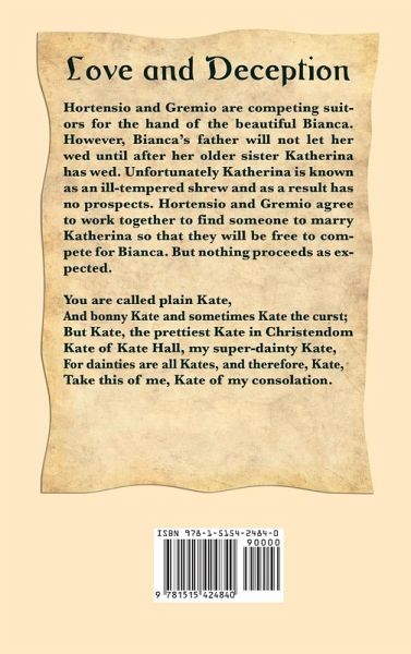 Love and Deception--Hortensio and Gremio are competing suitors for the hand of the beautiful Bianca. However, Bianca's father will not let her wed until after her older sister Katherina has wed. Unfortunately Katherina is known as an ill-tempered shrew and as a result has no prospects. Hortensio and Gremio agree to work together to find someone to marry Katherina so that they will be free to compete for Bianca. But nothing proceeds as expected.