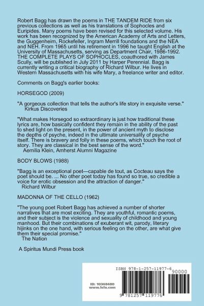 THE TANDEM RIDE is a book that follows the poet, teacher and translator Robert Bagg on various outdoor, deskbound, and romantic adventures, from boyhood through adolescence and maturity into old age. The poems are often composed in narrative blank verse or traditional forms, including Spenserian stanzas and sonnet sequences. Bagg's comfort zone has remained since his college days within the heady precincts of Greek myth, while writing about contemporary subjects in colloquial American speech.