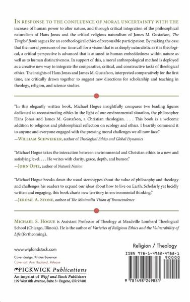 In response to the confluence of moral uncertainty with the increase of human power to alter nature, and through critical integration of the philosophical naturalism of Hans Jonas and the critical religious naturalism of James M. Gustafson, The Tangled Bank argues for an ecotheological ethics of responsible participation. By making the case that the moral pressures of our time call for a vision that is as deeply naturalistic as it is deeply theological, a critical perspective is advanced that is attuned to human embeddedness within nature as well as to human distinctiveness. In support of this, a moral anthropological method is deployed as a creative new way to integrate the comparative, critical, and constructive tasks of theological ethics. The insights of Hans Jonas and James M. Gustafson, interpreted comparatively for the first time, are critically drawn together to suggest new directions for scholarship and teaching in theology and religion and science studies.
