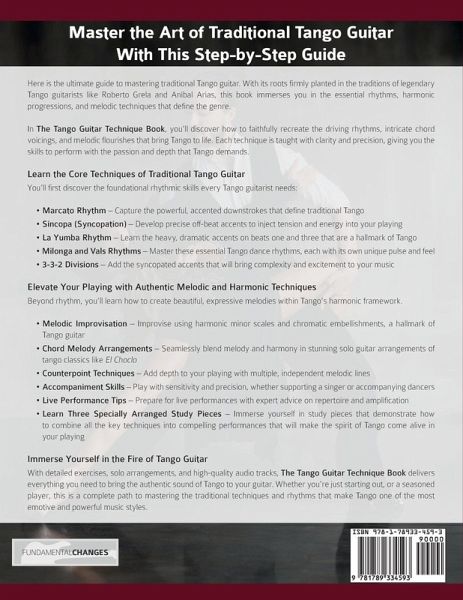 Master the Art of Traditional Tango Guitar Want to discover the passion and depth of authentic Tango guitar? Ready to learn the authentic techniques that have shaped this timeless genre? The Tango Guitar Technique Book is the ultimate guide to mastering traditional Tango guitar. With its roots firmly planted in the traditions of legendary Tango guitarists like Roberto Grela and Aníbal Arias, this book immerses you in the essential rhythms, harmonic progressions, and melodic techniques that define the genre. In The Tango Guitar Technique Book, you'll discover how to faithfully recreate the driving rhythms, intricate chord voicings, and melodic flourishes that bring Tango to life. Each technique is taught with clarity and precision, giving you the skills to perform with the passion and depth that Tango demands. Learn the Core Techniques of Traditional Tango Guitar You'll first discover the foundational rhythmic skills every Tango guitarist needs: Marcato Rhythm - Capture the powerful, accented downstrokes that define traditional Tango Síncopa (Syncopation) - Develop precise off-beat accents to inject tension and energy into your playing La Yumba Rhythm - Learn the heavy, dramatic accents on beats one and three that are a hallmark of Tango Milonga and Vals Rhythms - Master these essential Tango dance rhythms, each with its own unique pulse and feel 3-3-2 Divisions - Add the syncopated accents that will bring complexity and excitement to your music Elevate Your Playing with Authentic Melodic and Harmonic Techniques Beyond rhythm, you'll learn how to create beautiful, expressive melodies within Tango's harmonic framework. Melodic Improvisation - Improvise using harmonic minor scales and chromatic embellishments, a hallmark of Tango guitar Chord Melody Arrangements - Seamlessly blend melody and harmony in stunning solo guitar arrangements of tango classics like El Choclo Counterpoint Techniques - Add depth to your playing with multiple, independent melodic lines Accompaniment Skills - Play with sensitivity and precision, whether supporting a singer or accompanying dancers Live Performance Tips - Prepare for live performances with expert advice on repertoire and amplification Learn Three Specially Arranged Study Pieces - Immerse yourself in study pieces that demonstrate how to combine all the key techniques into compelling performances that will make the spirit of Tango come alive in your playing Immerse Yourself in the Fire of Tango Guitar With detailed exercises, solo arrangements, and high-quality audio tracks, The Tango Guitar Technique Book delivers everything you need to bring the authentic sound of Tango to your guitar. Whether you're just starting out, or a seasoned player, this is a complete path to mastering the traditional techniques and rhythms that make Tango one of the most emotive and powerful music styles. Don't Just Read It, Hear It! As with every Fundamental Changes guitar method, The Tango Guitar Technique Book contains over 100 audio examples that bring every exercise and musical study to life. Listen to fully notated examples and practice along with backing tracks to perfect your Tango guitar playing in real time. Buy it now and begin your journey into the powerful world of authentic Tango guitar!