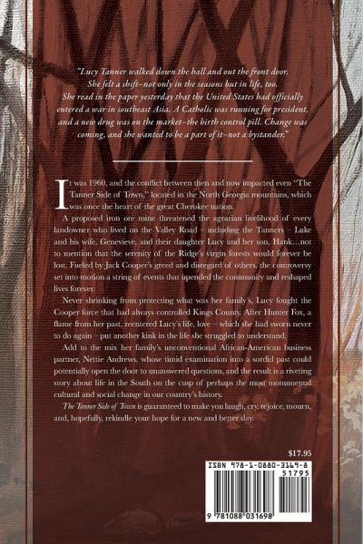 "Lucy Tanner walked down the hall and out the front door. She felt a shift - not only in the seasons but in life, too. She read in the paper yesterday that the United States had officially entered a war in southeast Asia. A Catholic was running for president, and a new drug was on the market - the birth control pill. Change was coming, and she wanted to be a part of it - not a bystander." It was 1960, and the conflict between then and now impacted even "The Tanner Side of Town," located in the North Georgia mountains, which was once the heart of the great Cherokee nation. A proposed iron ore mine threatened the agrarian livelihood of every landowner who lived on the Valley Road - including the Tanners - Luke and his wife, Genevieve, and their daughter Lucy and her son, Hank...not to mention that the serenity of the Ridge's virgin forests would forever be lost. Fueled by Jack Cooper's greed and disregard of others, the controversy set into motion a string of events that upended the community and reshaped lives forever. Never shrinking from protecting what was her family's, Lucy fought the Cooper force that had always controlled Kings County. After Hunter Fox, a flame from her past, reentered Lucy's life, love - which she had sworn never to do again - put another kink in the life she struggled to understand. Add to the mix her family's unconventional African-American business partner, Nettie Andrews, whose timid examination into a sordid past could potentially open the door to to unanswered questions, and the result is a riveting story about life in the South on the cusp of perhaps the most monumental cultural and social change in our country's history. "The Tanner Side of Town" is guaranteed to make you laugh, cry, rejoice, mourn, and, hopefully, rekindle your hope for a new and better day.